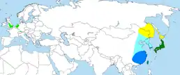 ![]() Ареал поширення мандаринки Гніздування Осіле проживання Шляхи міграції Зимування Інтродуковані популяції | ||||||||||||||||