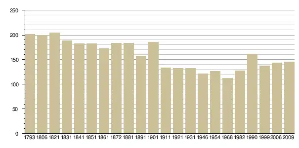 Динаміка населення (base Cassini de l'EHESS pour les nombres retenus jusque 1962[3], base Insee à partir de 1968 (population sans doubles comptes puis population municipale à partir de 2006)[4] · [5] ):