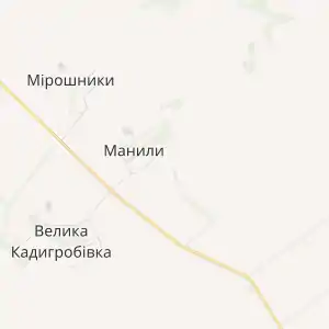 Село Манили знаходиться на відстані 1 км від сіл Мірошники і Велика Кадигробівка.