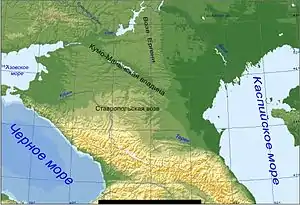 - Каспійсько-Чорноморський вододіл або «корок» (за Є. Н. Бадюковою, 2002) в гирлах р.р. Калаус і Західний Манич, на висоті +25 м абс.