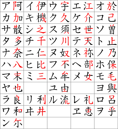 - Використовується часткове китайське прочитання: 安 (あ), 楽 (ら), 天 (て);