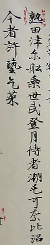 | イ段(甲類) | 伊怡以異已移射五 | 支伎岐企棄寸吉杵來 | 子之芝水四司詞斯志思信偲寺侍時歌詩師紫新旨指次此死事准磯為 | 知智陳千乳血茅 | 二人日仁爾迩尼耳柔丹荷似煮煎 | 比必卑賓日氷飯負嬪臂避臂匱 | 民彌美三水見視御 | 里理利梨隣入煎 | 位為謂井猪藍 | 伎祇芸岐儀蟻 | 自士仕司時尽慈耳餌児弐爾 | 遅治地恥尼泥 | 婢鼻弥 | |