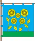 Квадратне полотнище складається з двох горизонтальних смуг — синьої і зеленої — у співвідношенні 5:1, з нижньої виходять п'ять соняхів з чорно-жовтими квітами, жовті стебла крайніх чотирьох похилені у вигляді сигля «М»[11].