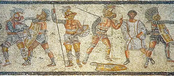 | Частина рабів проходила гладіаторську підготовку. Закуті у залізо за звичаєм їхнього народу, ці крупелярії, як їх звали, були надто незграбні для наступальних дій, проте, були непохитні в обороні... Піхота здійснила лобову атаку. Галльські лави подалися назад. Броньовані воїни затримали наступ: вони були невразливі для мечів та дротиків. Проте, римляни, використовуючи сокири та клевці, знищили обладунки разом з власниками, подібно тому як ламають мур. Інших гладіаторів збили на землю ратищами та тризубцями, та користуючись їхньою безпорадністю, залишили на смерть. |