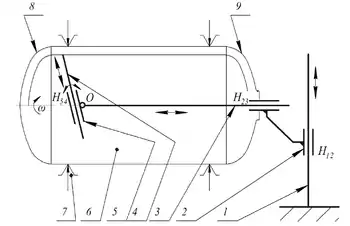 На рисунку 1 зображено структурну схему автоматичного маніпулятора, обладнаного механічною рукою, що являє собою одноланковий виконавчий механізм. Автоматичний маніпулятор складається з вертикальної стійки 1, на яку вільно насаджено обойму 2. Остання утворює зі стійкою кінематичну пару поступального переміщення вгору-вниз Н12. До обойми за допомогою кінематичної пари поступального переміщення Н23 приєднано горизонтальну штангу 3, що несе виконавчу ланку механічної руки 4. Ланку виконано у вигляді штока. Останній проходить через тангенціальний отвір у цапфі 5, що утворює обертову пару зі штангою 3. Так як шток утворює із цапфою кінематичну пару поступального руху Н54, то це дає йому можливість при повороті цапфи 5 навколо шарніра О переміщуватись поступально відносно цапфи. Переміщення закріпленого на руці 4 робочого органу за еквідистантою до твірної еліптичної поверхні забезпечується додаванням трьох рухів.