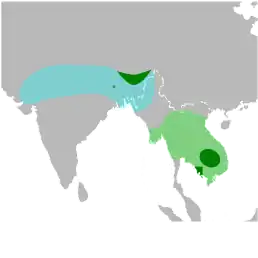 Історично вид був поширений на більшій частині Південної Азії від Пакистану, Індії та Шрі-Ланки до Борнео, але зараз він розмножується лише у двох популяціях на сході Індії (в Ассамі та Біхарі) та Камбоджі (узбережжя озера Тонлесап). Взимку він мігрує на південь, досягаючи В'єтнаму, Таїланду та М'янми. Індійська популяція оцінюється у 900-1100 птахів, камбоджійська — 150 гніздових пар.