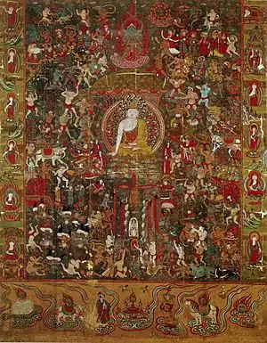 З правого і з лівого боку картини зображені дванадцять образів Будди, а в нижній її частині сім скарбів чакравартіна — восьмикутник, воєначальник, кінь, слон і т. д., які також були символічними атрибутами Будди, і в різних поєднаннях увійшли в іконографію буддійських зображень; вони символізують владу Будди над «трьома світами».