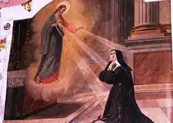 У монастирі її розбив параліч, зцілення від якого вона приписала заступництву Богородиці, після чого зважилася вести аскетичне життя, вступила в 1671 році в монахині у Візитандинський монастир у Парэ-Ле-Моніалі й там назвалася за іменем Пресвятої Діви Марії.