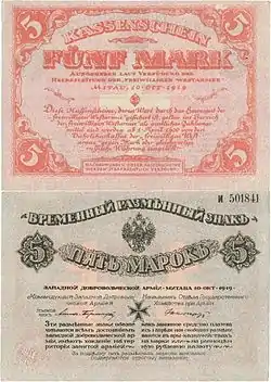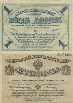 Папір, бавовняне волокно | Командувач Західною Добровольчої Армією: Полковник Павло Рафаїлович Бермондт-Авалов; Начальник Відділу Державного Господарства при Армії: Борис Олександрович Енгельгардт | Б, В, Г, Д, З, Л, П, С, Ф, Х, Ц; Y, Z, U | |