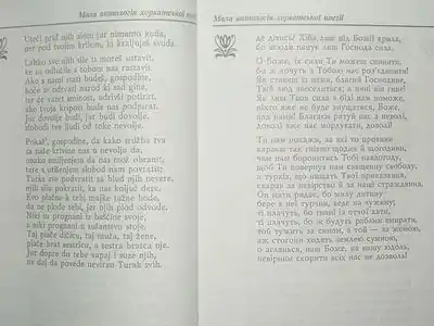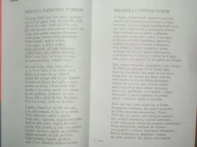 «Молитва супроти турків» Марка Марулича в оригіналі хорватською і в перекладі українською Дмитра Павличка, ч.1 (ліворуч) і ч.2 (праворуч), джерело: Ідея світу. Мала антологія хорватської поезії. У перекладах Дмитра Павличка., К.: «Основи», 2008. — С. 16—19 | ||