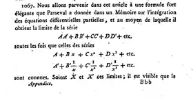 - «Méthode générale pour sommer, par le moyen des intégrales définies, la suite donnée par le théorème de M. Lagrange, au moyen de laquelle il trouve une valeur qui satisfait à une équation algébrique ou transcendente»