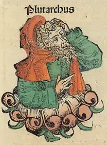 Плутарх[3] (грец. Πλούταρχος, лат. Plutarch, близько 46 — 120/125 до Р. Х) подібно Діонісію, він прагне підкреслити те загальне, що є в культурі римлян і греків і разом з тим деколи вдається до пояснення латинських термінів з допомогою грецьких слів з подібним звучанням, що приводить його до неправильних тверджень. Але, використовуючи цей прийом, він проявляє себе як автор, намагається самостійно осмислити матеріал, яким він володіє, а не як компілятор. Втім, просте компілювання у стародавніх авторів з точки зору джерелознавства несе в собі, як нам здається, більше позитивних рис, ніж негативних, оскільки в більш-менш чистому вигляді доносить до нас відомості з втрачених творів. Для Плутарха характерно приведення кількох відомих йому версій, що свідчить про його неабиякої ерудиції. Особливо добре він знає грецьких письменників, у тому числі і Діокла з Пепаретоса, а також Проматиона, автора «Історії Італії».