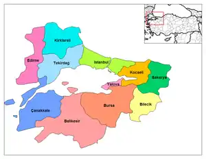 | Іли | Баликєсір Біледжик Бурса Едірне Киркларелі Коджаелі Сакар'я Стамбул Текірдаґ Чанаккале Ялова | |||
