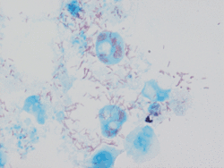 ![]() Rickettsia conorii у вигляді червоних стрижнів у культурі клітин Vero (збільшення у 1х103) Rickettsia conorii у вигляді червоних стрижнів у культурі клітин Vero (збільшення у 1х103) | |