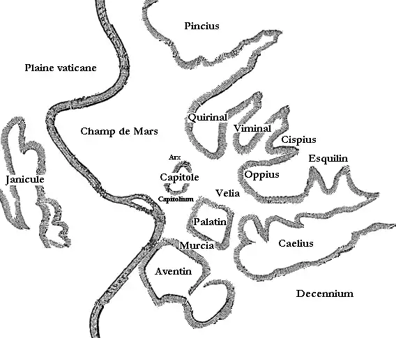 Марсове поле (Champ de Mars) на мапі Риму до заснування міста Ромулом. Вигляд на річку Тибр та схили: