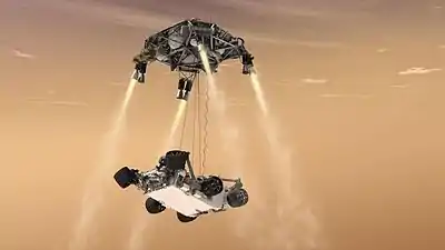 Приблизно на висоті 1,6 км від поверхні від космічного апарату з парашутом відокремились марсохід Curiosity і «небесний кран» (Sky Crane) — спеціальний апарат з ракетними двигунами.
