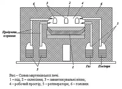 Мартенівська піч (рис.) являє собою споруду з вогнетривкої цегли, яка стягнута рядом металічних балок, що утворюють зовнішній каркас. Робочий простір печі обмежений зверху склепінням, знизу — подом, спереду і ззаду — стінками, з боків — головками. Головки служать для подачі палива і повітря в робочий простір печі, а також для відводу продуктів згоряння з печі. Піч має вигляд овальної чаші, в ньому відбувається процес плавки. Передня стінка має ряд завалочних вікон для завантаження шихтових матеріалів, а задня стінка — льотку для випуску металу.