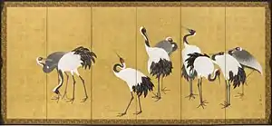 Ще однією улюбленою темою, як зрештою й інших японських майстрів, було зображення журавлів. Для правильного зображення художник тривалий час спостерігав за птахами на природі, вивчав європейські та японські праці з зоології для точного зображення.