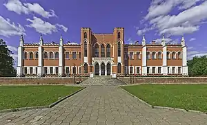 Колись барокова садиба з чіткою осьовою і симетричною побудовою зазнала руйнації під час війни з Наполеоном, а потім перебудови надали їй характер пізнього класицизму. Класицизм тоді швидко втрачав позиції привабливості. І нова володарка садиби (Софья Володимирівна Паніна) розпочала чергову перебудову. Проект в стилістиці романтизму створив архітектор Михайло Биковський в 1-й половині 19 століття.