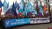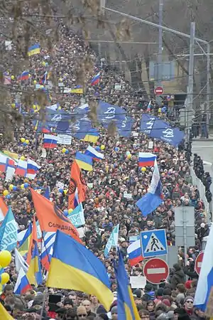 Багатотисячний Марш миру проходив у Москві, Санкт-Петербурзі, Єкатеринбурзі[1], Самарі[2], Магадані, спрямований проти військової агресії президента Росії Володимира Путіна щодо України[3], нагнітання ненависті, закриття вільних ЗМІ. Кількість учасників у Москві оцінювалась від 10 тисяч[4] до 50 тисяч (така кількість була офіційно заявлена)[2]. Учасники йшли з прапорами Росії та України, скандували «Украина, мы с тобой» та «Нет войне». Відомий музикант Андрій Макаревич заявив журналістам з телеканалу «Дождь», що прийшов на Марш проти того, щоб «завтра проснуться в стране, которая находится в состоянии войны, а в состоянии войны с Украиной — я просто себе представить даже не могу»[5][6]. Від самого початку мітинг мав стосунок лише щодо відношення до України, але пізніше опозиціонер Навальний проголосив, що протести повинні затронути тематику тиску на російські ЗМІ.
