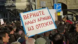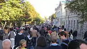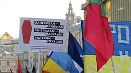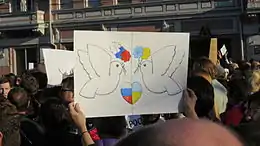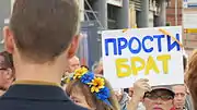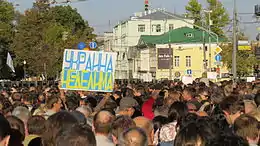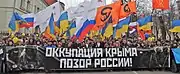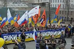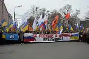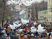 ![]() Біля 50 тисяч осіб з прапорами Росії, України, політичних партій та символами миру | |||||||||