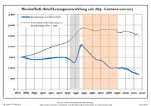 Динаміка населення з 1875 року в сучасних кордонах (Синя лінія: населення; Пунктир: відносна порівняльна динаміка населення землі Бранденбург; Сірий фон: період Третього рейху; Помаранчевий фон: період НДР)