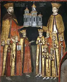 Вотивний живопис на Монастир Маму: засновник Костянтин Бринковяну з чотирма синами на лівій стороні фрески, а праворуч його дружина, пані Марія, з шістьма дочками.