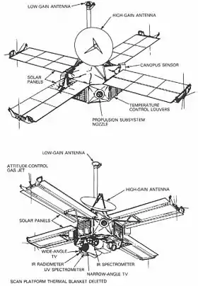 Корпус космічного апарату має форму восьмигранника 138,4 см в ширину і 45,7 см у висоту. Корпус із магнієвого сплаву, негерметичний. Чотири сонячні батареї з розмахом 5,80 м прикріплені до верхньої частини апарату. Параболічна антена діаметром 116,8 см із високим коефіцієнтом посилення встановлена у верхній частині апарату, а всенаправлена антена з низьким коефіцієнтом посилення закріплена на щоглі висотою в 223,5 см установленої поруч із параболічною антеною. Загальна висота космічного апарата склала 3,35 м, а маса — 411,8 кг. Корпус розділений на вісім відсіків, у яких розмістилася електронна апаратура, кабелі, корекційна рухова установка, ємності з газом для системи орієнтації та регулюючі пристрої. У центрі нижньої поверхні корпусу розміщена двовісна сканувальна платформа.