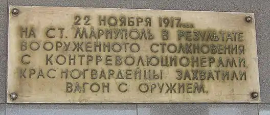 22 листопада 1917 року червоноармійці тут відбили у своїх ворогів вагон із зброєю. З нагоди про ці події на будівлі вокзалу встановлені мармурові меморіальні дошки.