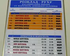 - Розклад руху пасажирських та приміських поїздів по станції Маріуполь на сайті «Укрзалізниці»