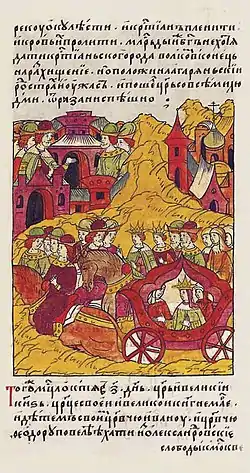 | І тако поживе цар Іван Васильович з царицею своєю Марьєю 8 рік і місяць 6. І окормляя бисть від зрадників отрутою від стольника Василя Хомутова з товаришами, їх же цар Іван Васильович злий смерті зрадимо: в котлі звари… |