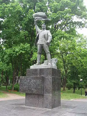 - пам'ятник на братській могилі учасників Жовтневого збройного повстання 1917 року у вигляді гранітної урни на постаменті. Встановлено 1935 року, архітектор Василь Онащенко. Від час війни пам'ятник було зруйновано, відновлено 6 листопада 1949 року, архітектор Зиновій Чечик. У 2014 році урну та таблички з написами знищено «невідомими»;
