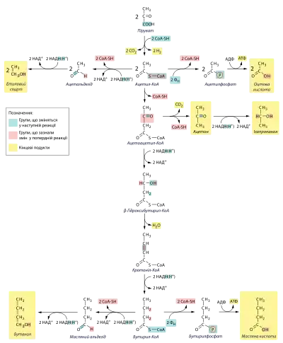 Якщо внаслідок виділення органічних кислот у процесі маслянокислого бродіння pH опускається нижче 4,4 у бактерій активуються шляхи, кінцевими продуктами яких є етанол, ацетон та бутанол. В кожному із цих шляхів використовується НАДH, проте жоден із них не дає більше двох моль АТФ на моль глюкози.[1][3]