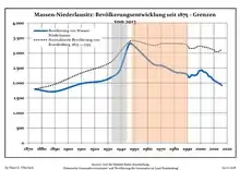 Динаміка населення з 1875 року в сучасних кордонах (Синя лінія: населення; Пунктир: відносна порівняльна динаміка населення землі Бранденбург; Сірий фон: період Третього рейху; Помаранчевий фон: період НДР)