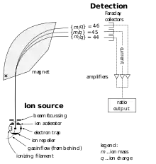 - Магнітний і/або електростатичний секторний мас-спектрометр (англ. Sector instrument)