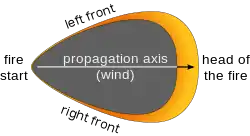 Двовимірні моделі зростання пожежі, такі як Farsite [8] і Прометея, [9] модель зростання пожежі канадського Wildland призначена для роботи в канадських комплексах палива, була розроблена, які застосовуються такі напівемпіричні відносини і інші щодо земля-корона переходів для розрахунку поширення вогню і інші параметри уздовж поверхні. Деякі припущення повинні бути зроблені в моделях, таких як Farsite і Прометеєм формувати зростання вогню. Наприклад, Прометей і Farsite використовувати принцип Гюйгенса поширення хвиль. Набір рівнянь, які можуть бути використані для поширення (форма і напрямок) фронт вогню за допомогою еліптичної форми був розроблений в 1990 році Річардс [10] Незважаючи на те, більш складні програми використовують тривимірну систему чисельного прогнозування погоди, щоб забезпечити вхідні сигнали, такі як швидкості вітру до однієї з моделей зростання пожежі, перерахованих вище, вхід був пасивним і зворотний зв'язок вогонь на атмосферні вітру і вологості, не враховується.