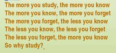 Чим більше вчишся, тим більше знаєш. Чим більше знаєш, тим більше забуваєш. Чим більше забуваєш, тим менше знаєш. Чим менше знаєш, тим менше забуваєш. Але чим менше забуваєш, тим більше знаєш. То для чого вчитися?