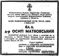 Повідомлення про смерть Осипа Матковського у газеті "Свобода" 1968 рік.