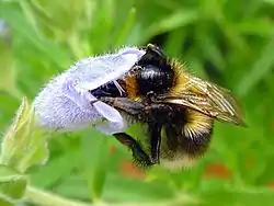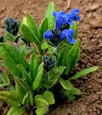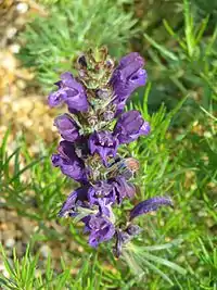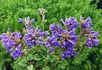 Квітки великі, світло-синього або фіолетового кольору, розташовані у несправжніх мутовках в пазухах верхніх листків, що утворюють щільне кулясте або пухке довгасте суцвіття. Чашечка трубчаста або трубчасто-дзвоникувата, з 15 жилками, п'ятизубчаста, пряма або вигнута, двогуба, з тризубчастою верхньою губою, зубці якої в 2-3 рази коротше ланцетних зубців нижньої губи, або ж чашка невиразно двогуба, із зубцями майже однакової довжини. При основі зубців майже завжди є потовщена складка, всі зубці чашечки зазвичай з різко виступаючими поперечними жилками (анастомозами). Віночок з вузькою при основі, розширеною догори губкою і двогубим відгином, верхня губа пряма або злегка зігнута, на верхівці виїмчаста або глибоко надрізана, нижня трилопатева, з більшою середньої лопаттю. Тичинок 4, з них 2 верхні трохи довші нижніх, рівні або ж зрідка сильно виставляються з віночка. Пиляки голі або волосисті, двогнізді, з гніздами, що розходяться. Стовпчик нагорі з двома рівними шилоподібними частками. Період цвітіння — червень — липень. Плоди — довгасті, гладенькі горішки коричневого або бурого кольору, з'являються в серпні — вересні.