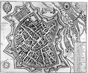 - plattegrond Zaltbommel met grachten en wallen. Opschriften. Gravure met watermerk in de vorm van een kroon en de letter M. Ongedateerd.
