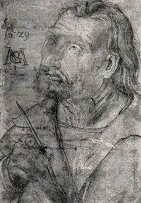 | Йоахим Зандрарт. Гіпотетичний портрет молодого Грюневальда. Монограма Дюрера - фальшива. | ||||