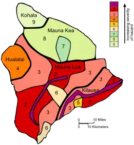 Хоча вулканічні виверження на Гаваях рідко призводять до жертв (єдина пряма історична смерть через вулканічну активність на острові сталася на Кілауеа в 1924 р., коли незвично вибухове виверження кинуло скелі на оглядача), майнові збитки внаслідок затоплення лави є загальним і дорогим явищем.[56] Гавайські виверження, як правило, призводять до надзвичайно повільних потоків, які просуваються в кроковому темпі, представляючи невелику небезпеку для життя людини, але не виключно;[57] Виверження Мауна-Лоа 1950 року викинуло стільки лави за три тижні, скільки поточне виверження Кілауеа виробляє за три роки, і лава досягла моря протягом чотирьох годин від початку, поглинувши село Хоокена Маука та головну автодорогу на шляху до нього.[46] Попереднє виверження в 1926 р. поглинуло село Хоопулоа Макаї[47], а Хіло, частково побудоване на лавах виверження 1880-81 років, перебуває під загрозою майбутніх вивержень.[43] Виверження 1984 року майже досягло міста, але зупинилося невдовзі після того, як потік було перенаправлено вище за течією.[58]