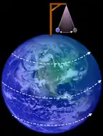 Маятник Фуко є математичним маятником, площина коливань якого повільно повертається відносно поверхні Землі в бік, протилежний до напрямку обертання Землі. Зсув маятника, встановленого в довільній точці на Землі, можна пояснити дією сили Коріоліса, яка найбільша на полюсі і відсутня на екваторі[3]. Що менша широта місцевості, то менша швидкість відхилення маятника.