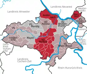 Район складається з 84 міст і громад (нім. Gemeinden), об'єднаних в 7 об'єднань громад (нім. Verbandsgemeinden), а також трьох самостійних міст, що не входять до складу об'єднань громад.