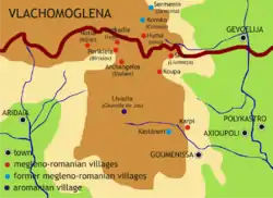 ![]() Мапа меглено-румунських поселень в Греції та Македонії | |