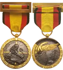 Медаль, призначена для військовослужбовця має стрічку з яскраво жовтою смугою в центрі потім двома червоними смугами і двома вузькими чорними смужками по краях. Медаль, призначена не для військовослужбовця (цивільної особи, що бере активну участь в бойових діях або нестройових осіб), має замість чорних зелені смужки по краях.