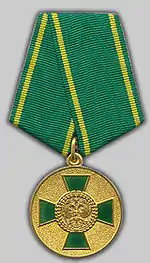 - На лицьовій стороні медалі — прямий рівнокінцевий хрест з кінцями, що розширюються, покритий зеленою емаллю. По краях хреста — вузький опуклий рант. У центрі хреста — рельєфне зображення Державного герба Російської Федерації, обрамлене вінком з пшеничних колосків.