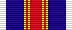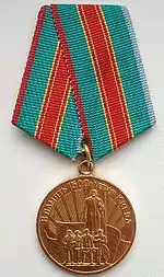 Медаль за допомогою вушка і кільця з'єднується з п'ятикутною колодочкою, обтягнутою шовковою муаровою стрічкою зеленого кольору шириною 24 мм з подовжніми стрічками завширшки 2 мм червоного та блакитного кольорів по краях. Посередині стрічки — подовжня червона смужка, що має по боках по дві вузькі смужки золотавого кольору.