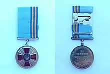 - Медаль виготовляється з білого металу і має вигляд кола діаметром 32 мм. На лицьовому боці медалі зображено малий Державний Герб України на тлі лаврового вінка, схрещених мечів вістрями угору та розбіжних променів. Зображення лаврового вінка — жовтого металу. Щит малого Державного Герба України покрито емаллю синього кольору.