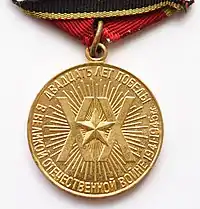 Медаль за допомогою вушка і кільця з'єднується з п'ятикутною колодочкою, обтягнутою шовковою муаровою стрічкою шириною 24 мм. На стрічці три подовжні смужки червоного (найширша), зеленого та чорного кольорів, по краю стрічки після чорної — вузька смужка зеленого кольору.